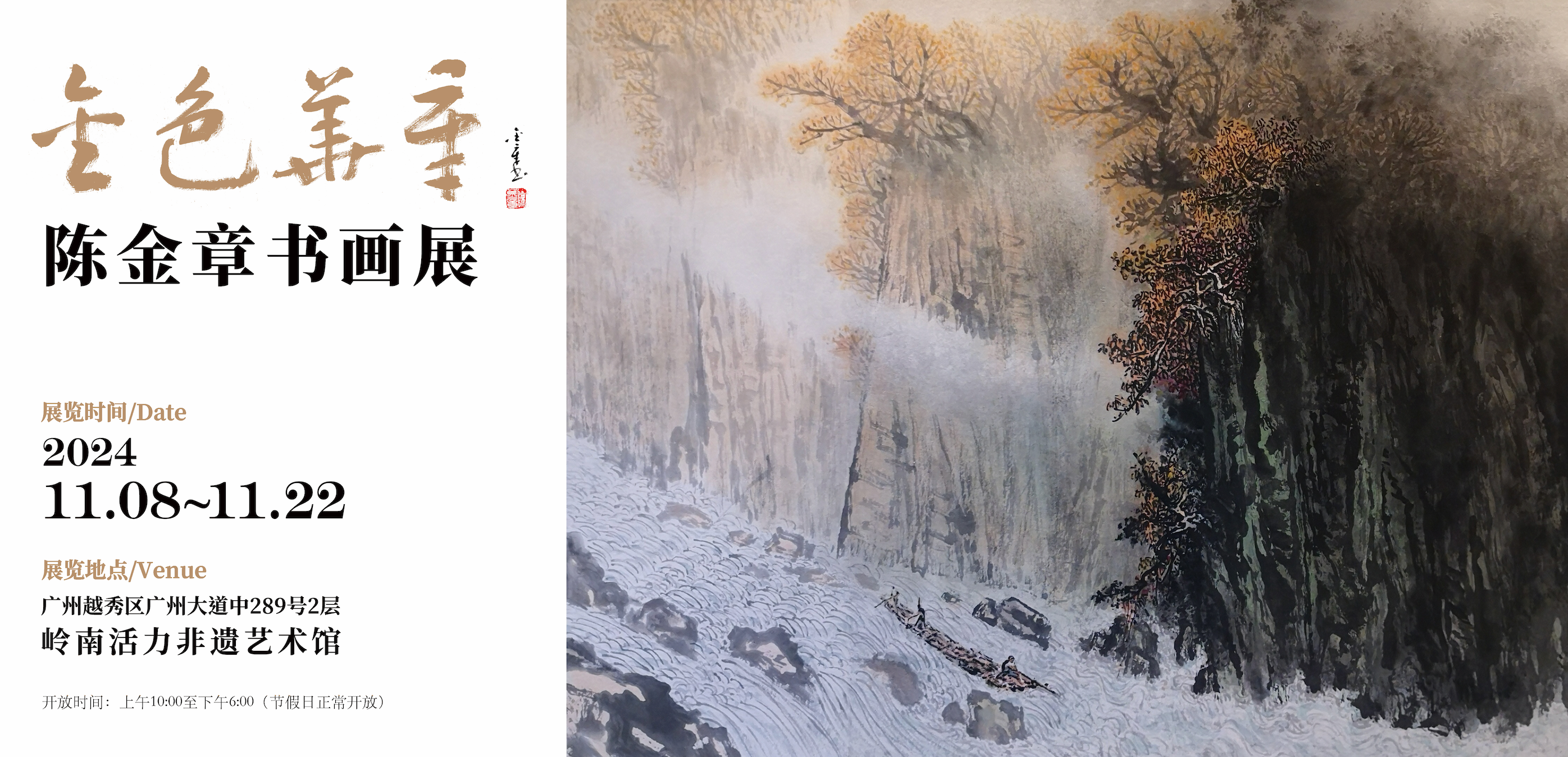 由广东洛克南方美术馆、耕堂文化主办,甲子文化、今天画廊承办,高剑父纪念馆、太和堂、沁芳园、比玉堂、871艺术、清和文化协办的“金色华章——陈金章书画展”将于11月8日在岭南活力非遗艺术馆正式开展。