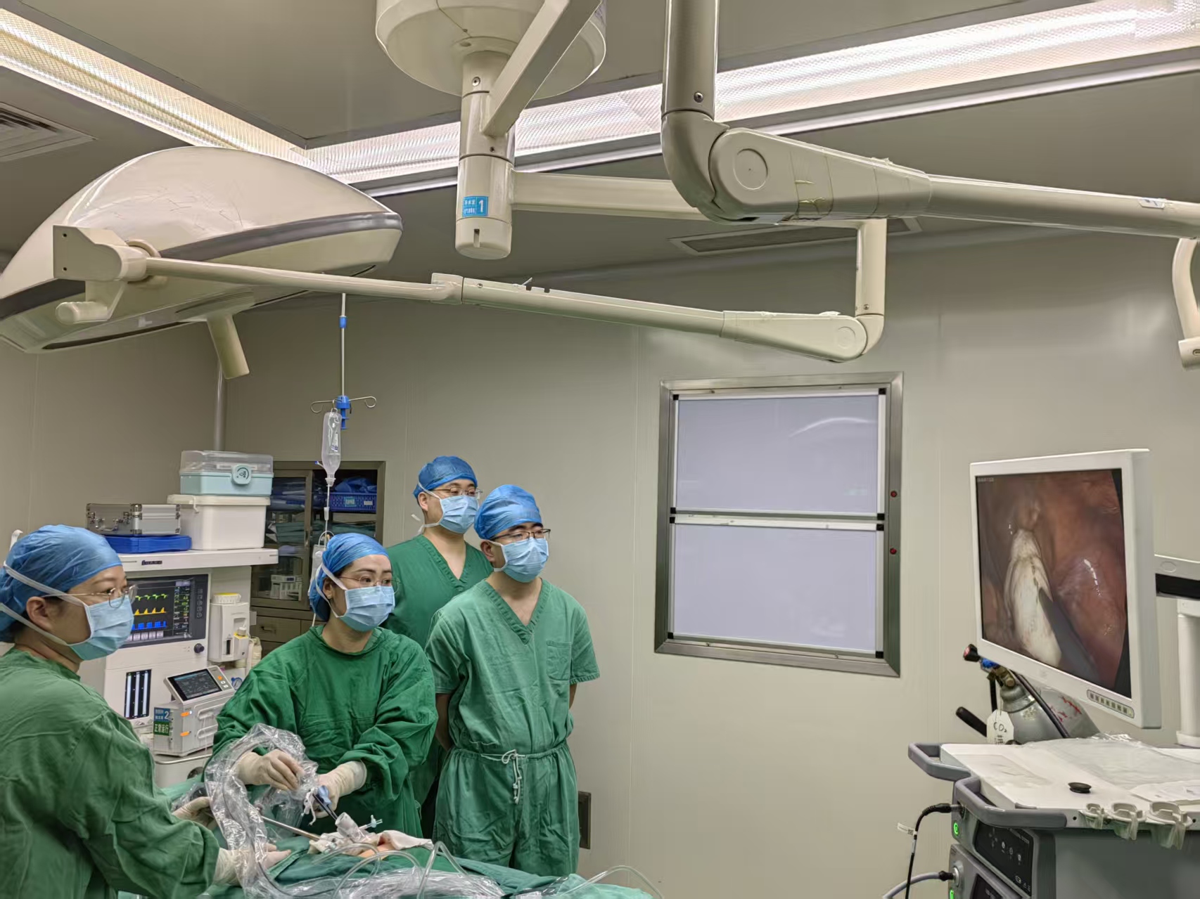医护团队正在进行经脐单孔腹腔镜手术。受访者供图